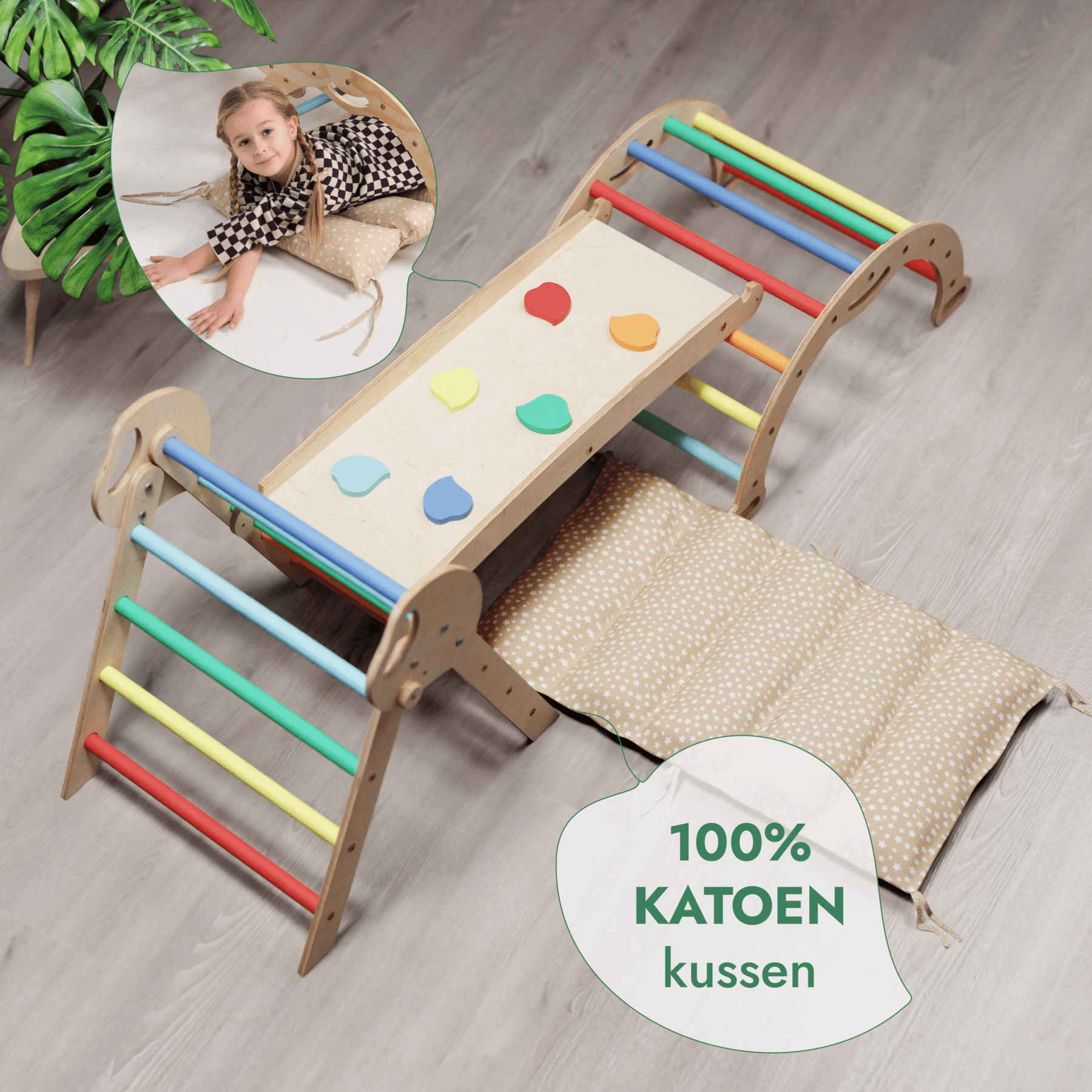 4-in-1 Klimset voor Peuters: Driehoek Ladder + Klimboog + Glijbaan + Kussen (1-3 jaar) - Regenboog