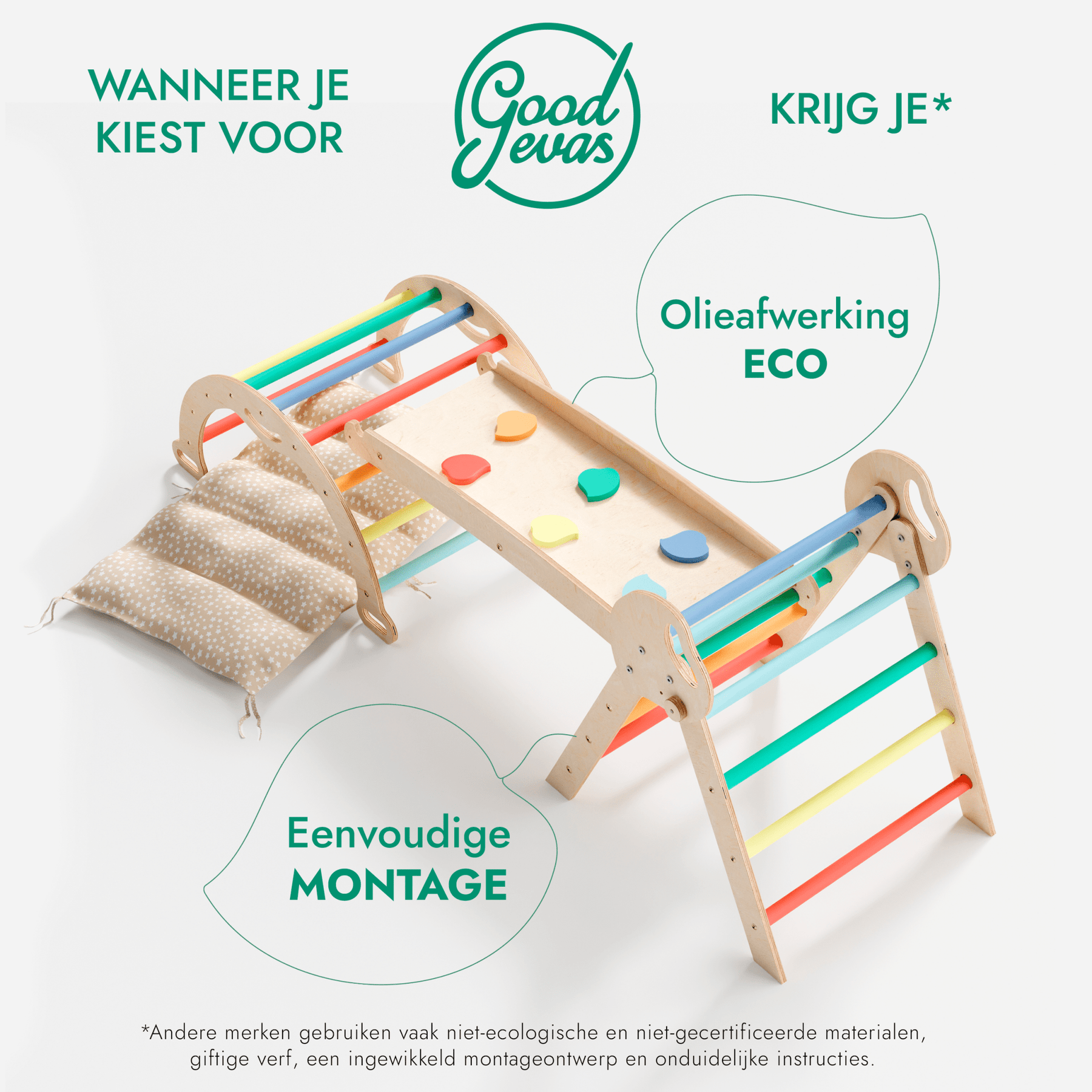 De set bevat een Pikler-driehoek, klimboog, glijplank en zacht kussen – alles wat je kind nodig heeft voor urenlang actief speelplezier. Dankzij het compacte formaat is de set zelfs ideaal voor kleine appartementen. Na het spelen kan de set eenvoudig worden opgevouwen en netjes worden opgeborgen. Gemaakt van natuurlijke, kindveilige materialen, is hij ontworpen om zowel duurzaam als mooi te zijn in elk huis.