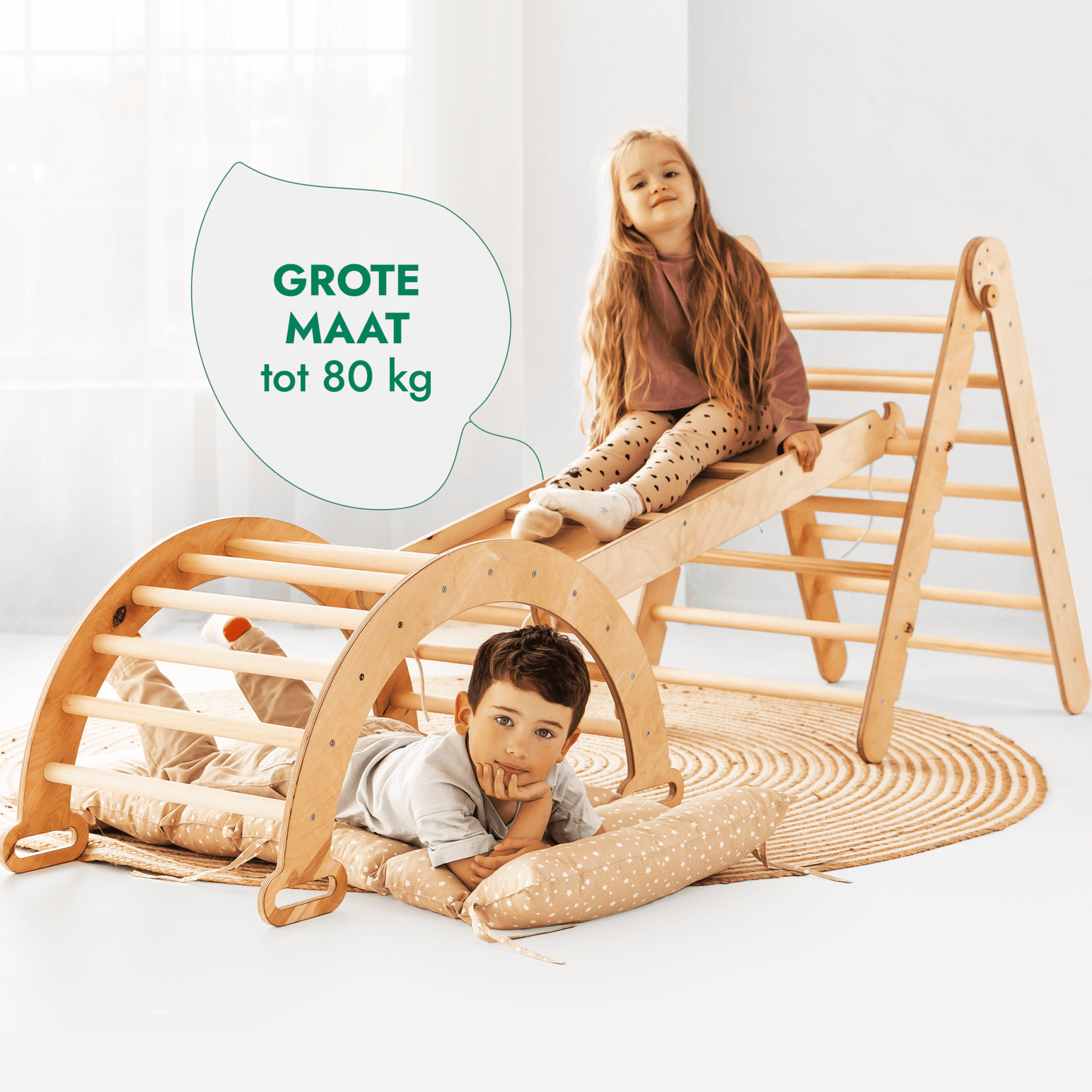 4-in-1 Montessori-Klimrek: Driehoek Ladder + Klimboog + Glijbaan + Kussen Beige